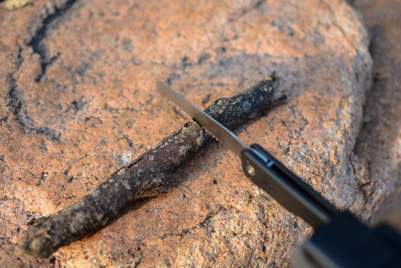 It is also true that when cutting some wood for firewood outdoors, the saw works very well, easily sawing the stick into two sections.