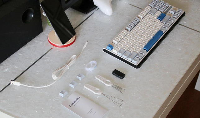 First of all, let's take a look at the packaging of Duga K620w, it uses a white box, with product models and renderings, open the box and take out all the items, you can see that its accessories are very rich, respectively USB data cable, USB adapter, key clip, shaft clip, Velcro storage strap, 3 keycaps, instructions and other items.