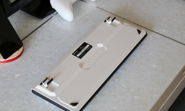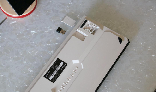 Let's take a look at the back of the Duga K620w, it is similar to our common keyboard, with anti-slip rubber pads and beveled brackets, but its beveled brackets have two sets of bevel brackets, corresponding to these different heights. In addition, a hidden storage compartment is also designed on the back, and the 2.4G receiver is very convenient to place inside, which can be taken out when needed and stored when not in use, avoiding the risk of rummaging around or losing it when needed.