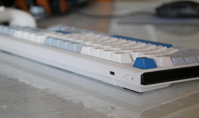 A USB interface and keyboard switch designed at the top of the fuselage, the USB interface is responsible for daily charging or USB connection mode use, the switch is the design of the lever, the arrow area on the front of the keyboard is also designed with four indicator lights, and its current connection mode is identified according to the light during daily use, this Duga K620w has a total of three connection modes, namely wired connection, 2.G wireless connection, and Bluetooth connection.