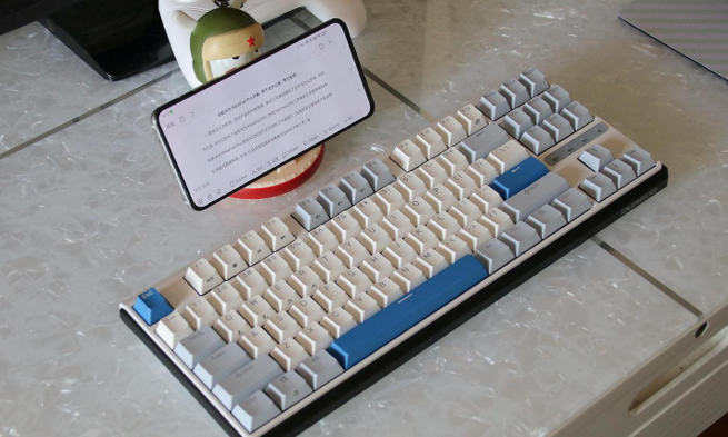 From the appearance point of view, the visual impact of the Duga K620w is quite good, the color scheme I chose is called fog blue, you can see that the color of the keycaps is combined, it is combined, and then the frame of the keyboard is made of black metal material, which is not only good visually, but also has an excellent touch.