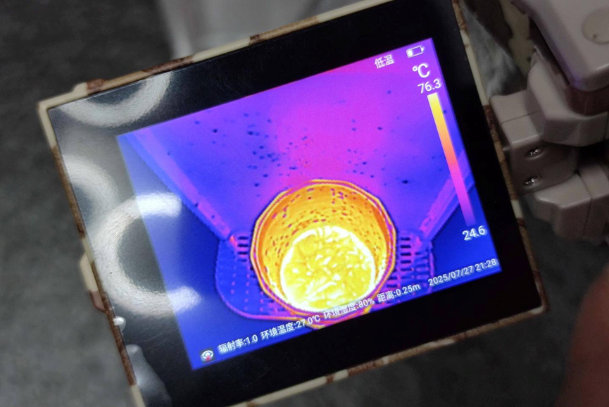 In order to be as accurate as possible, we also use a thermal imager on the equipment, which can be seen that the highest point is in the water glass, which is 74.7°C.