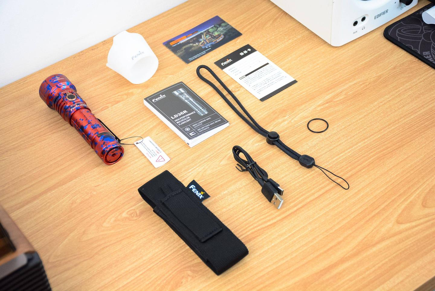 The packaging list is very rich. In addition to the Fenix LD36R flashlight, soft light cover, instruction manual, and warranty card, there are also cloth covers, Type-C charging cables, hand ropes, and spare waterproof rings. The details of the products produced by the large factory are indeed in place.